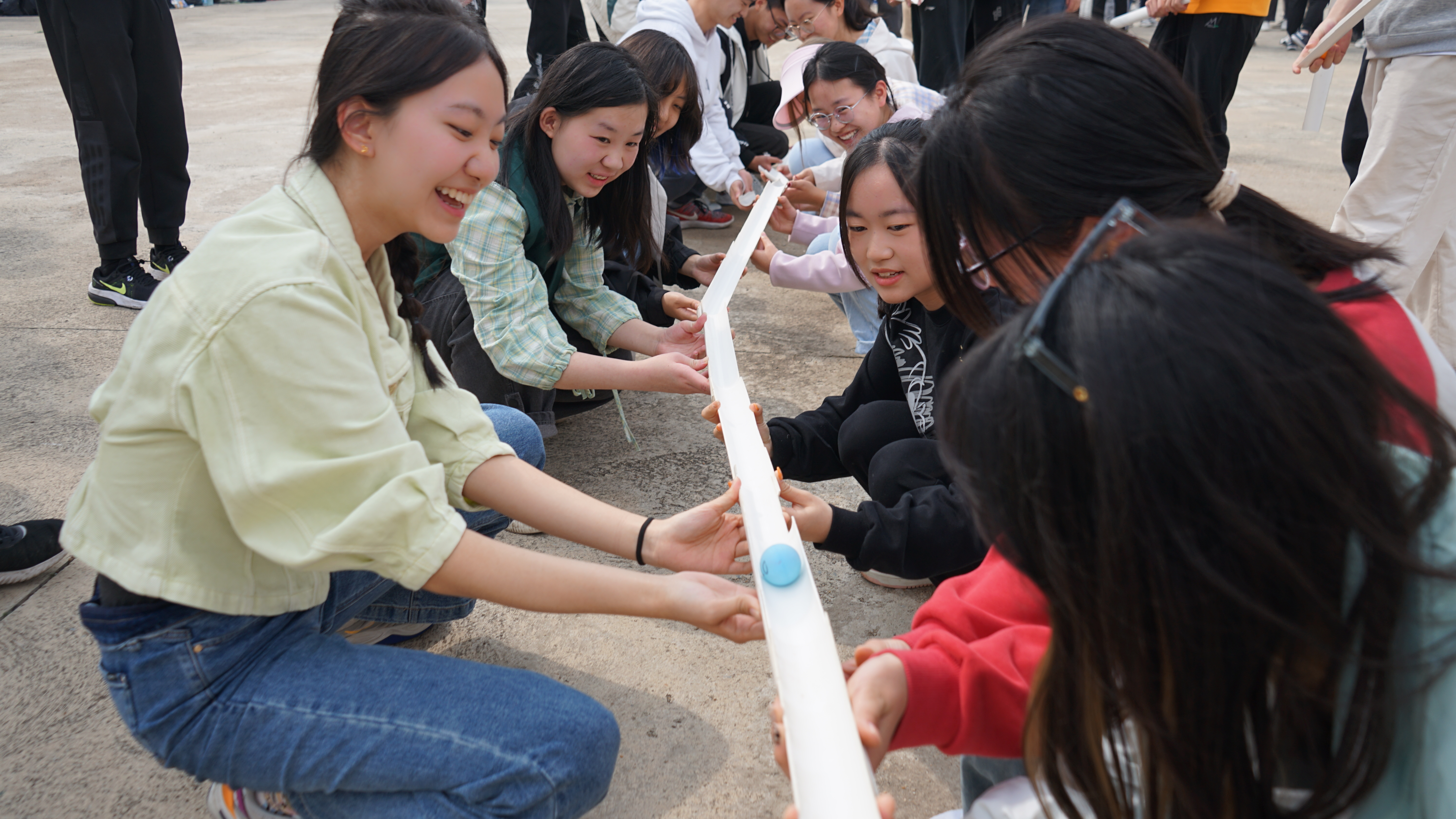 毕业墙要求每个班的同学互相帮助以搭人体的方式共同登上4.2米的高墙,在翻阅的过程中各位同学撑的撑,拉的拉,体现了强大的意志力与凝聚力,尽管在底下做支撑的许多同学肩膀已经出现血印,在墙上拉人的同学手臂肌肉已经麻木,但是靠着同学们的毅力和必胜的信念,11个班级全部战胜了面前的高墙,感受着翻阅过程中显现的道理,人生路上前行的三种力量:引导、支撑还有自己的努力。挑战150由四个环节组成,班级所有同学要发挥集体的智慧寻求更高效的方法在150秒内完成四个环节,短短的150秒通过几个不同的小项目来考验每个团队成员之间的默契程度、协作能力。让同学们在体验游戏、感受集体力量重要的同时又充满了欢声笑语。击鼓颠球和环游世界都考验了大家的默契和技巧,二十个人颠球的同频共振,三十个人一起“两人三足”的心有灵犀,都让大家感到自己真正融入了集体。堆叠宝塔,蛟龙出海,开始前的相互指导,开始后的相互鼓励,都体现了何为集体的风采。这些活动为同学们搭建了一个挑战自我、提高素质的平台。同学们不仅在是在游戏中模拟真实的情景,而且更是在竞技中检验参与者的应变技能,在训练中磨练团队意识、培养个人和团队在面对挑战时的信心和勇气。